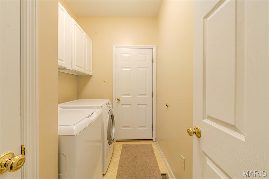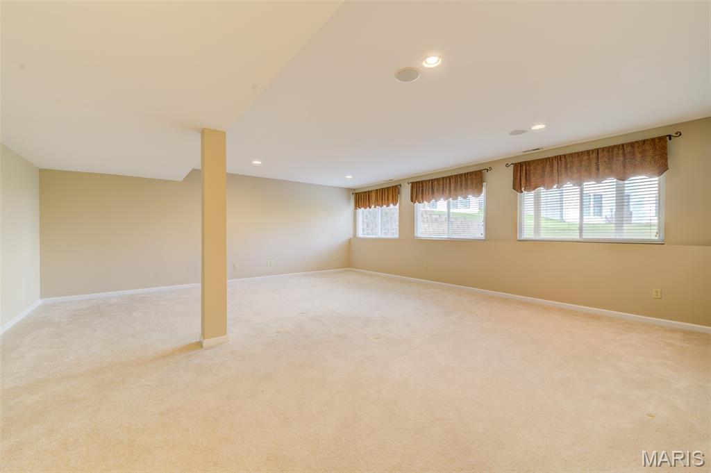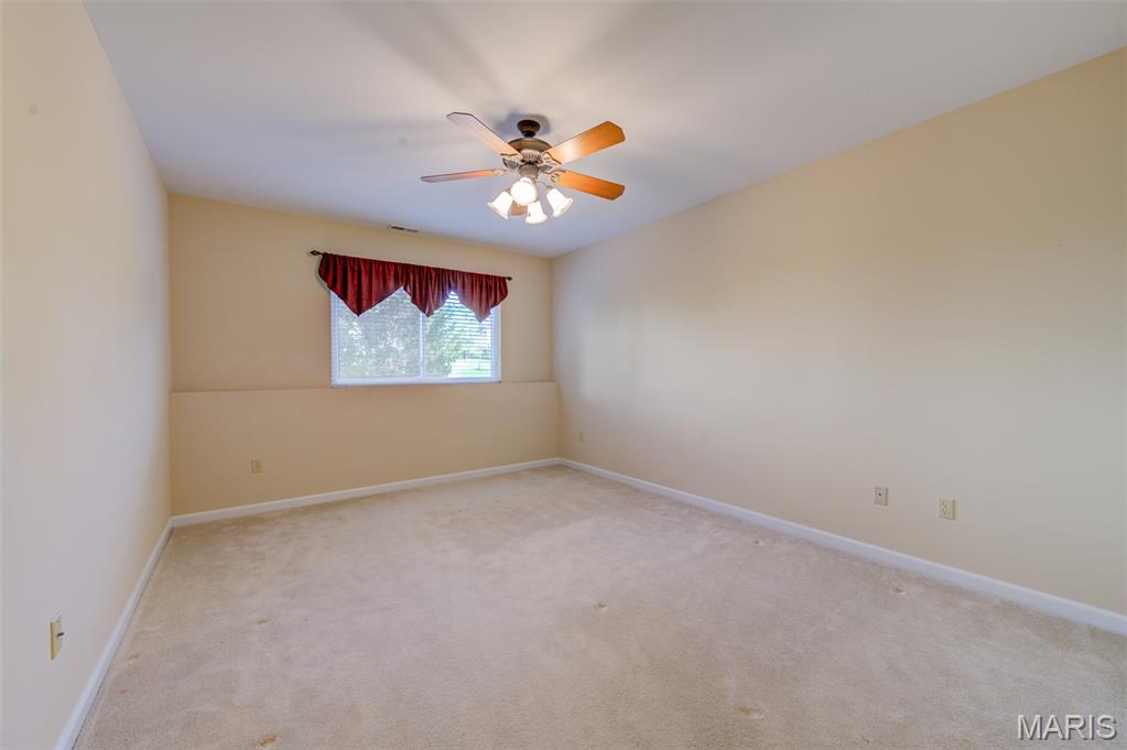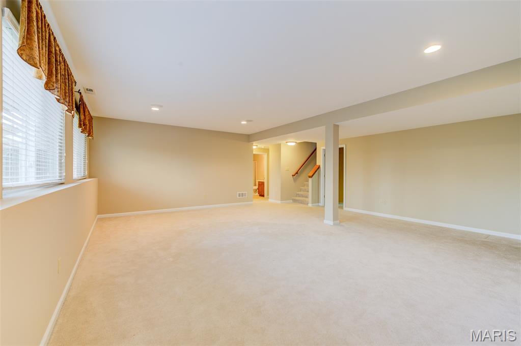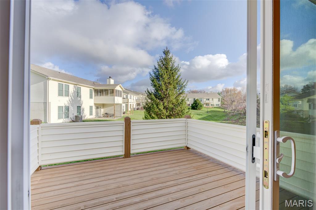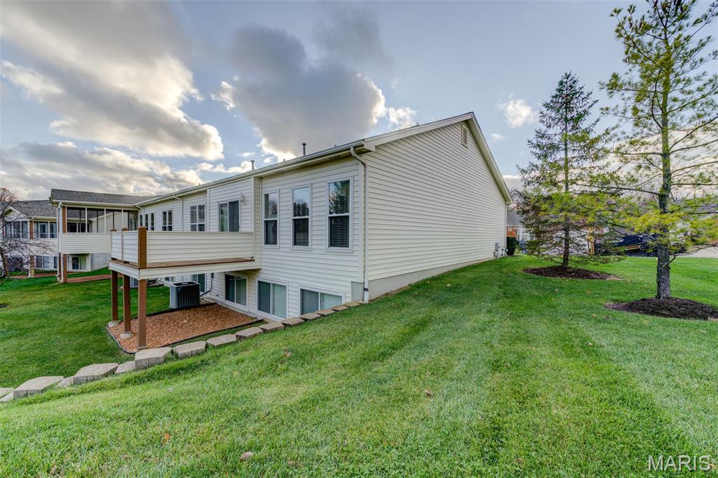 Envision yourself enjoying life in this freshly painted, MOVE-IN-READY ranch villa located a stroll away from Faust Park in Chesterfield! Gleaming hardwood floors enhance the foyer--and into the kitchen & breakfast room. Carpeting graces the large, vaulted great rm & dining rm & office/possible 3rd BR. A neutral color palette allows for your decorating touches to make this home special. The kitchen features stainless appliances: LG 'fridge with ice & water 2023, Microwave 2023. Disposer & washer are recent upgrades, too. Silestone countertops & ample cabinetry. And a pantry with wire-mold shelving. The breakfast bar offers more seating, extends the kitchen into the breakfast rm that opens to a private deck. The deck overlooks an expanse of green. A spacious owner's suite shares the main floor with a 9ft customized walk-in closet and ensuite bathroom w/step-in shower. * Easy, low-maintenance living now and for years to come * Your furnace & air systems with Smart controls are new in 2022, Water heater 2024. Most windows upgraded in 2016--with the newer roof. Even the electric service panel is newer, 2018. The main floor laundry & closet (washer & dryer stay) add convenience. How about a FINISHED LOWER LEVEL? An 8+foot foundation makes it feel even more roomy. There's a second bedroom with an adjacent (third!) full bath. The huge, open second family room/rec room is bathed in light from a wall of newer windows. A workshop/hobby wall in the storage area includes a utility sink and heavy-duty shelves. A sump system is there, too. The finished garage has a door opener and a pegboard tool wall--It's all here. The Villas at Ladue Bluffs offers a great location--at a great price. New Chesterfield condos are in the 700s to a million. Underground utilities, outside mgt, quiet streets. Flagship groceries, dozens of casual & premier restaurants, services & shopping abound. Chesterfield Valley is only 3 miles away. AAA Parkway Central and River Bend Elementary schools complete the package. A low HOA fee reminds you of the convenience it affords, covering common area maintenance, landscaping, snow removal, trash & recycling, irrigation & pest control.